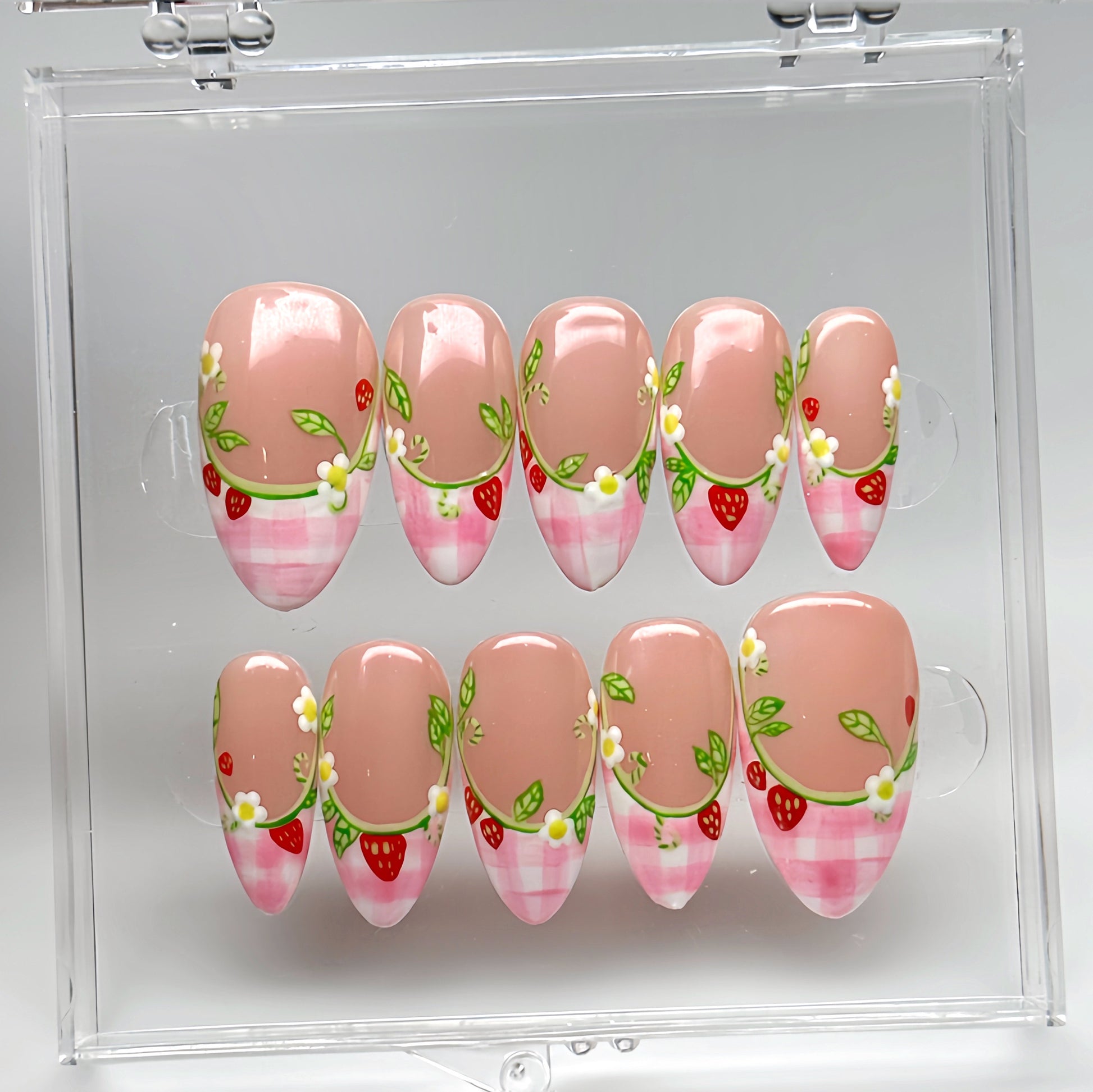 For custom sizing, select "Custom", at checkout and provide your individual nail sizes in the order of Thumb, Index, Middle, Ring, Pinky. Example: 1, 4.5, 4, 6, 8 or 15mm, 11mm, 12mm, 10mm, 9mm